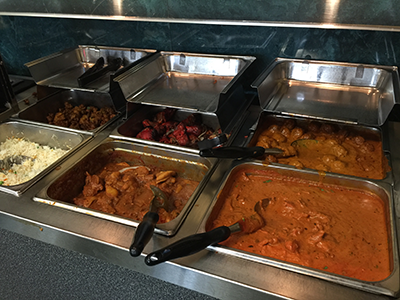 There are 4 non-vegetarian Dishes, 4 vegetarian dishes, appetizers, salads and 2 desserts and our items change everyday. Our specialties include samosa, pakora, chicken tikka masala, tandoori chicken, fresh naan, various meat curries, lamb, and a large selection of vegetarian dishes such as mattar paneer, kabli channa, punjabi kadhi, saag, vegetable korma etc. In addition to the great entree selections we feature freshly prepare salads, yogurt, papads and pickels as part of the daily buffet.